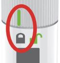 透明な底面を皮膚にしっかりとあてたまま、緑色の目印をロック解除の方向に止まるまで回し、 ロックを解除します